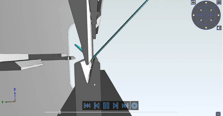 Il punto fondamentale del processo di piegatura in Almacam Bend è la completa simulazione 3D di ogni fase del ciclo della pressa-piegatrice, durante il quale il software controlla l’accessibilità delle operazioni e il rischio di collisioni.